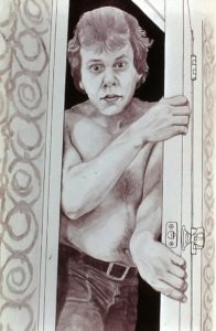 Gary and the Door | Pencil & Ink Drawing | 9″ x 18.5″ | 1974 | $1,000.00 (unframed)